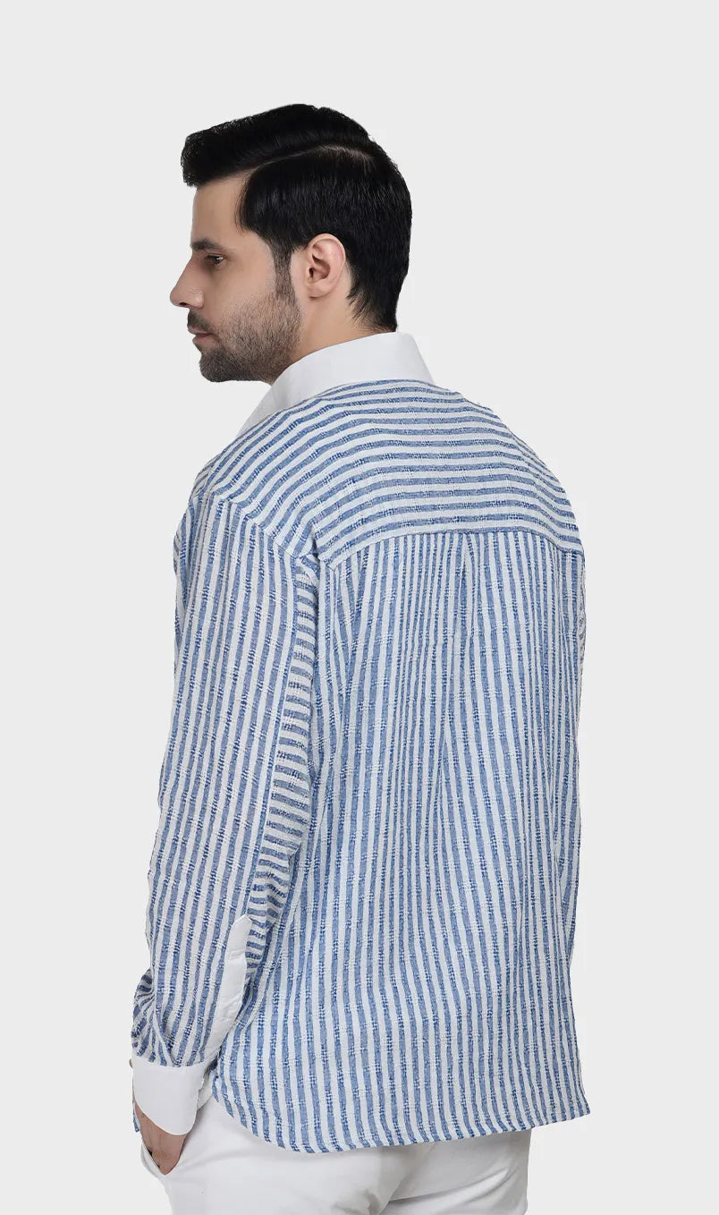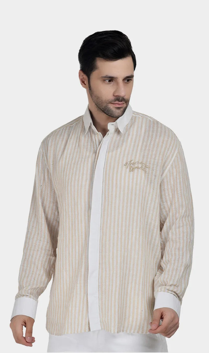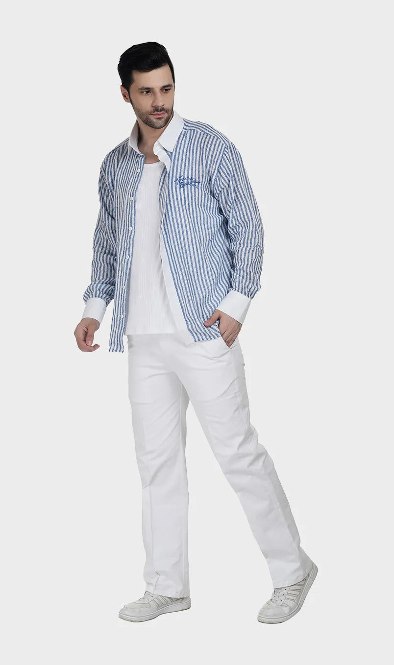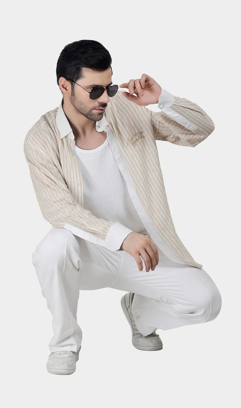 In soft cotton dobby with effortless beige-white and blue-white stripes, it’s the kind of piece that says you have nowhere urgent to be — and you’re enjoying every second of it. Light, breathable, and cut for comfort, it moves as easily as the conversation over a long lunch. Wear it when the afternoon is yours to own.
