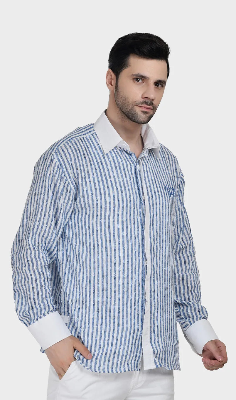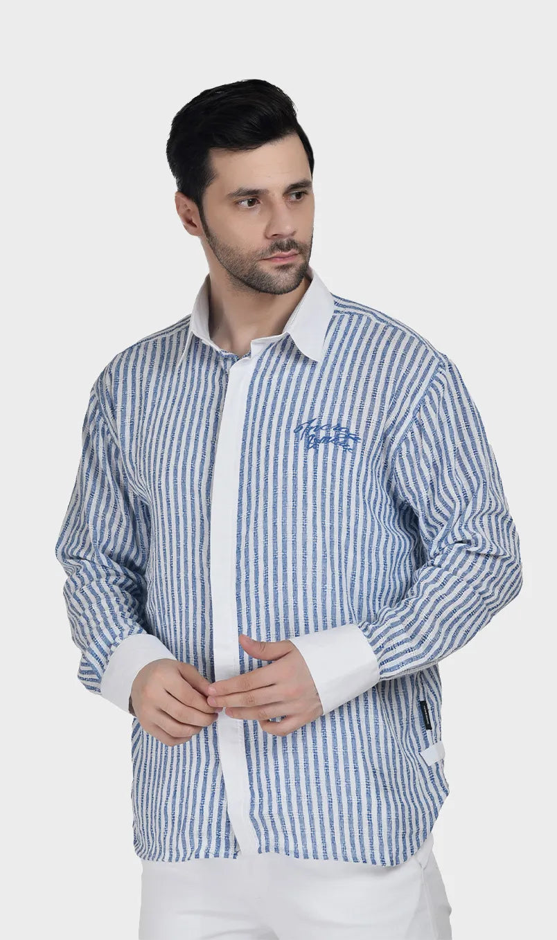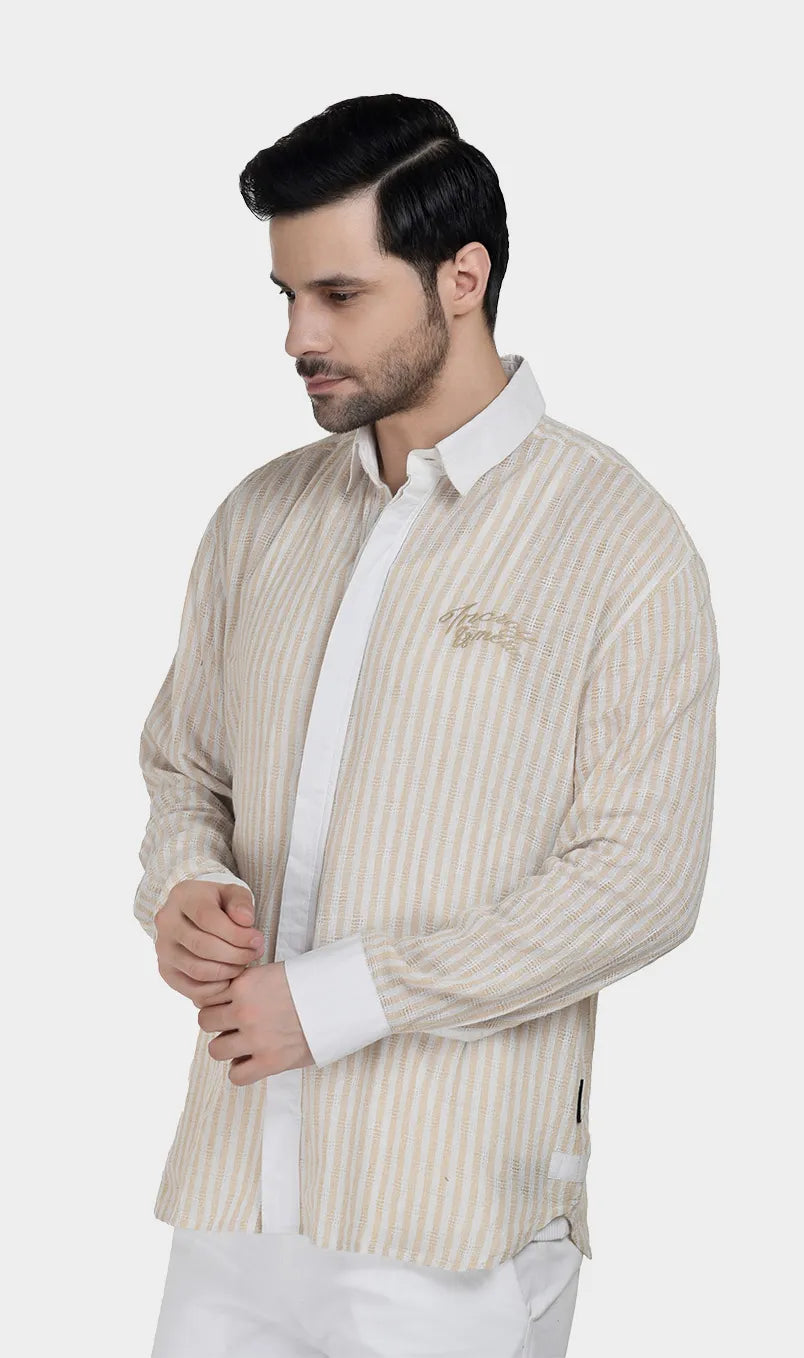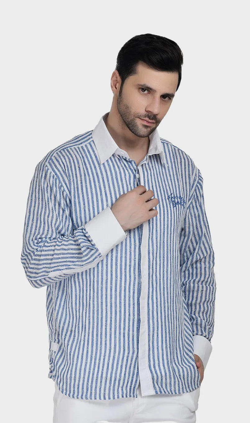In soft cotton dobby with effortless beige-white and blue-white stripes, it’s the kind of piece that says you have nowhere urgent to be — and you’re enjoying every second of it. Light, breathable, and cut for comfort, it moves as easily as the conversation over a long lunch. Wear it when the afternoon is yours to own.