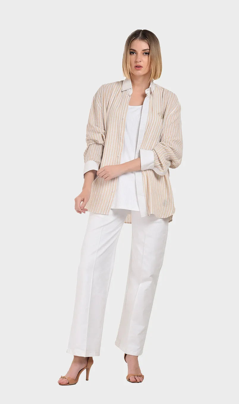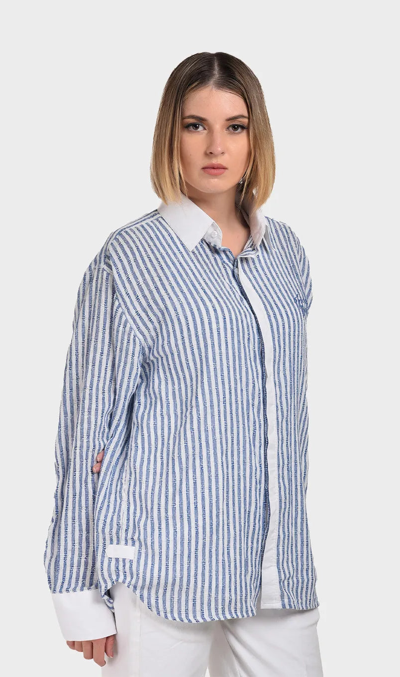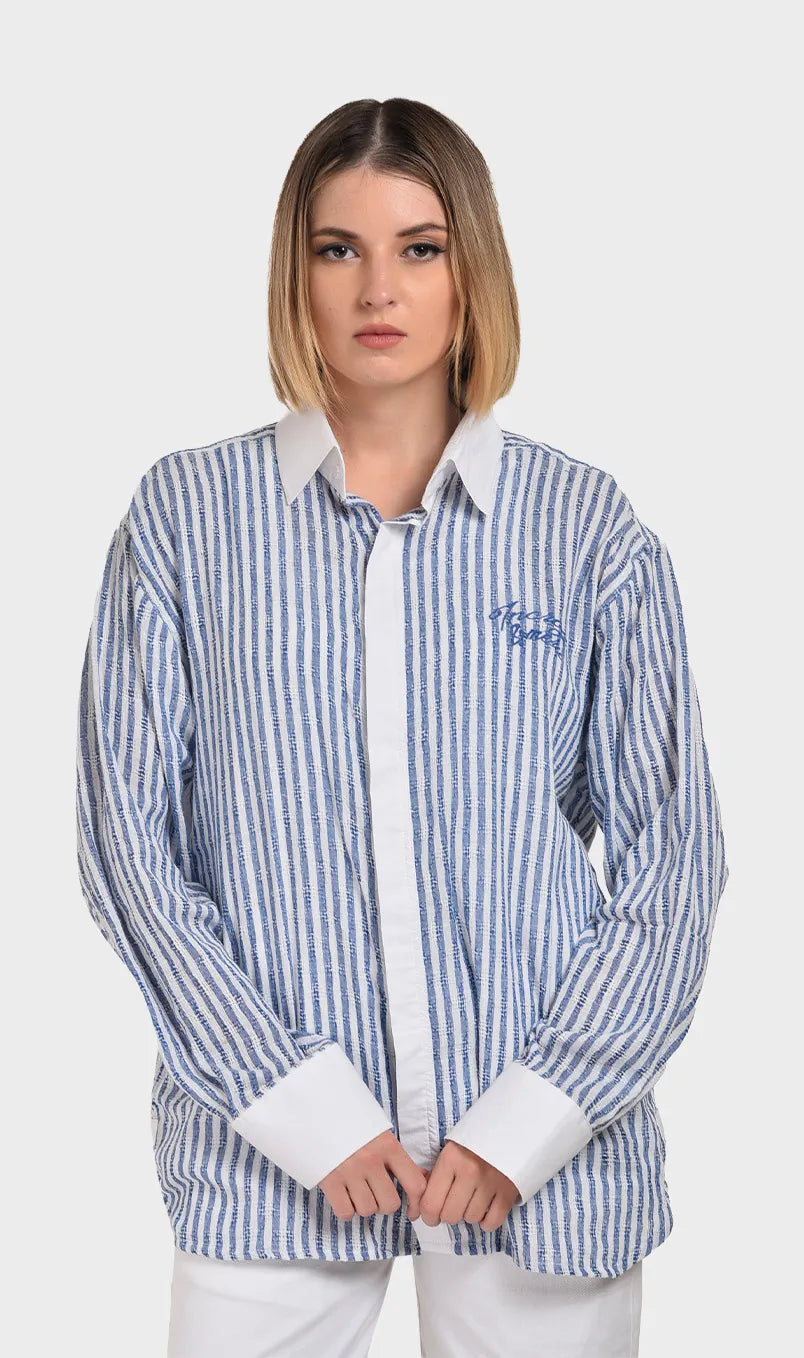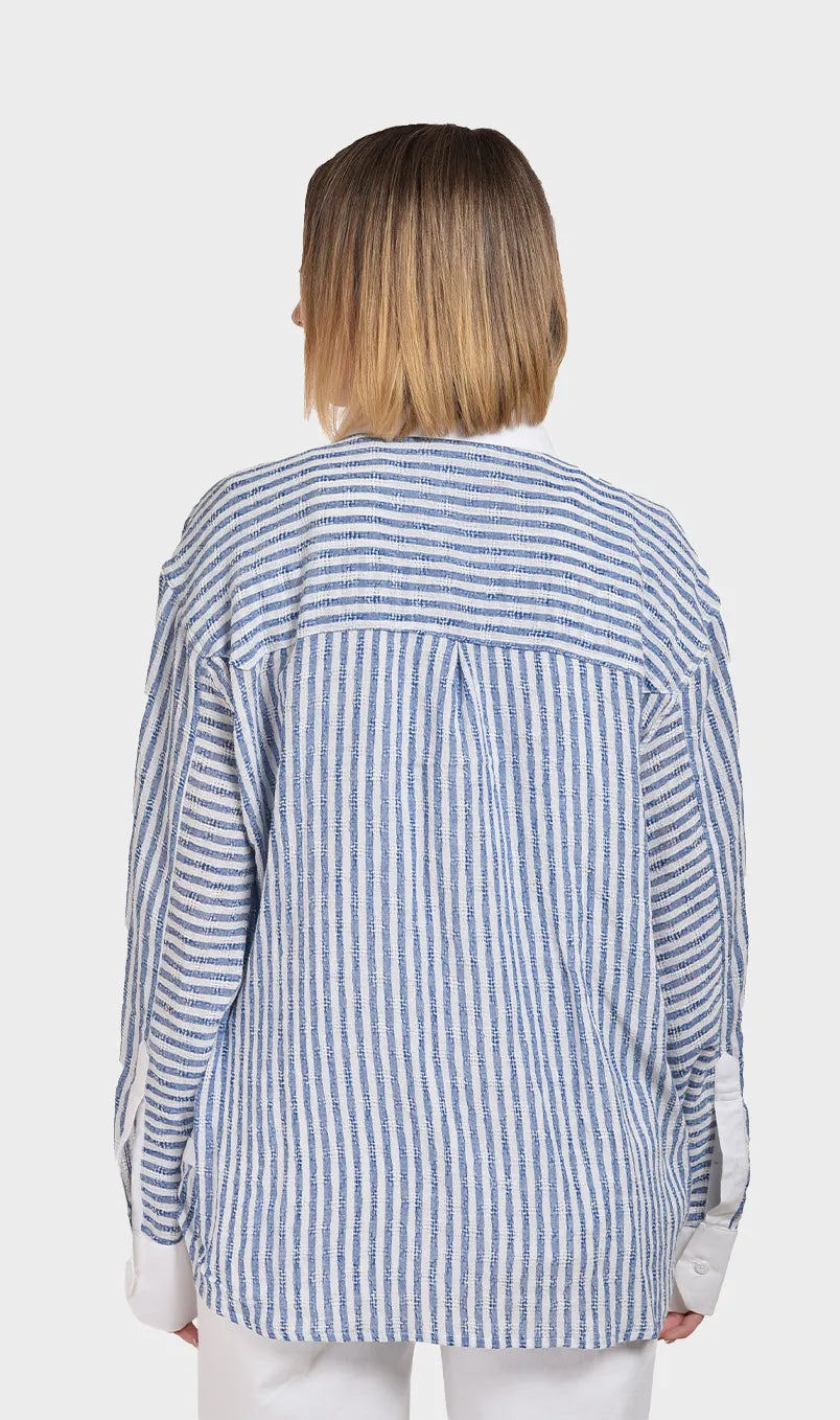 In soft cotton dobby with effortless beige-white and blue-white stripe…