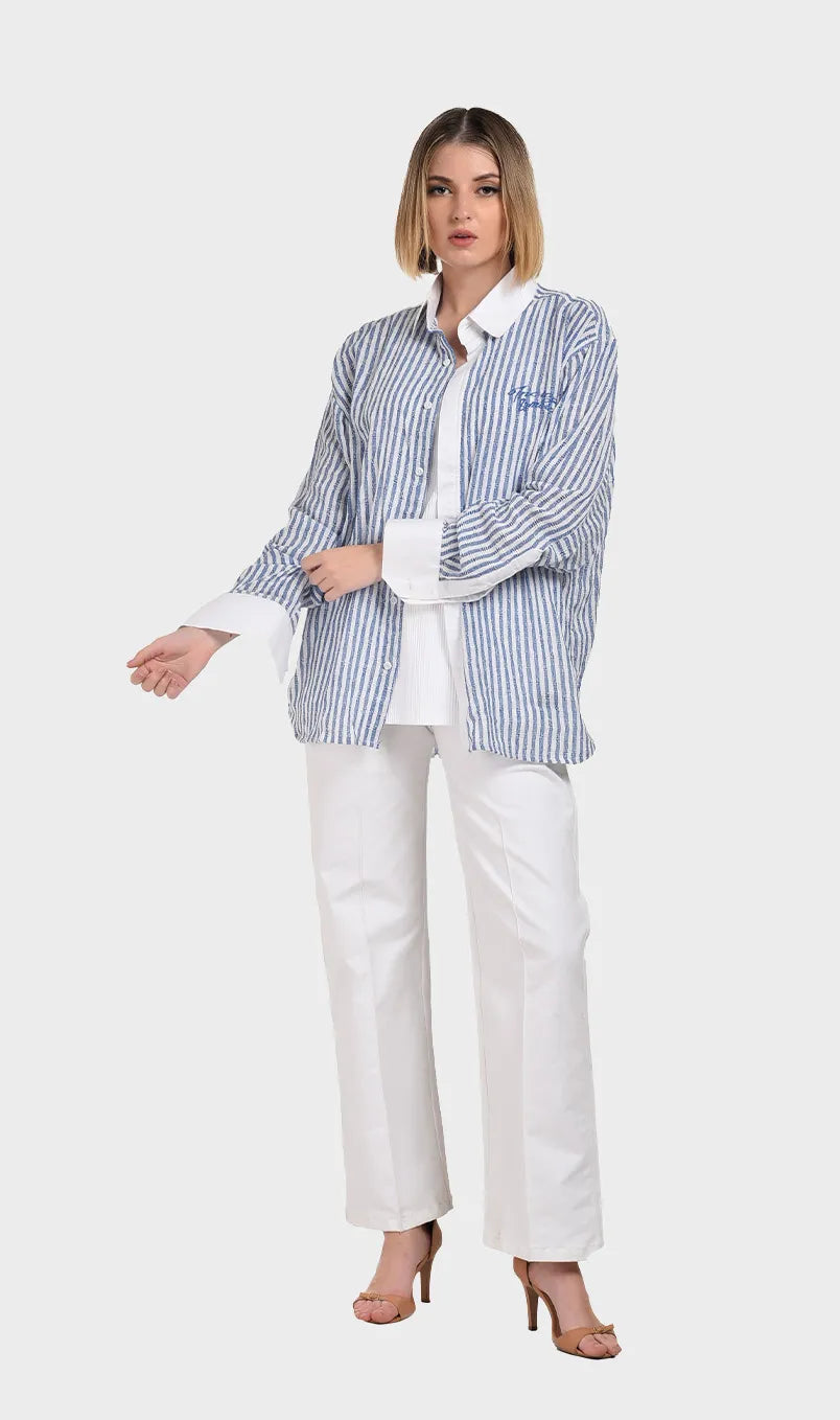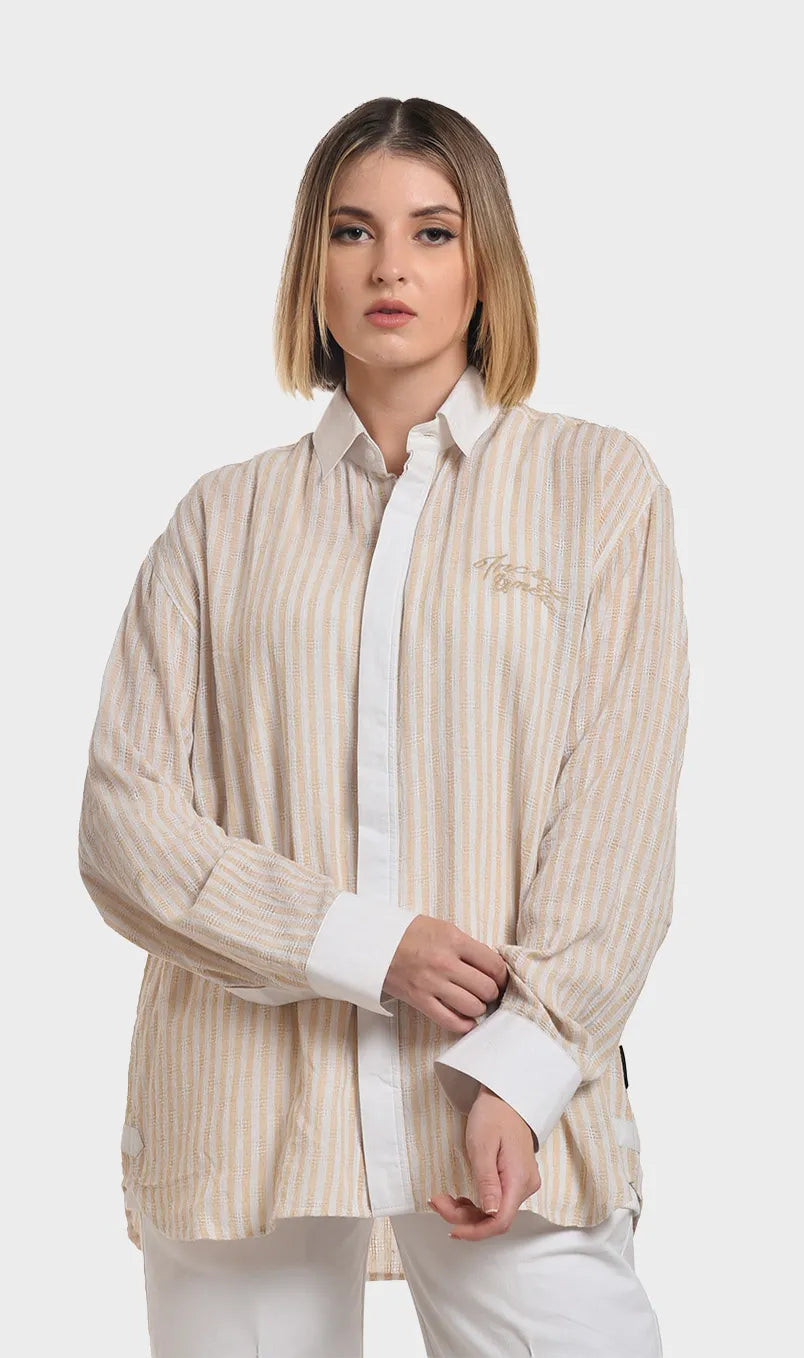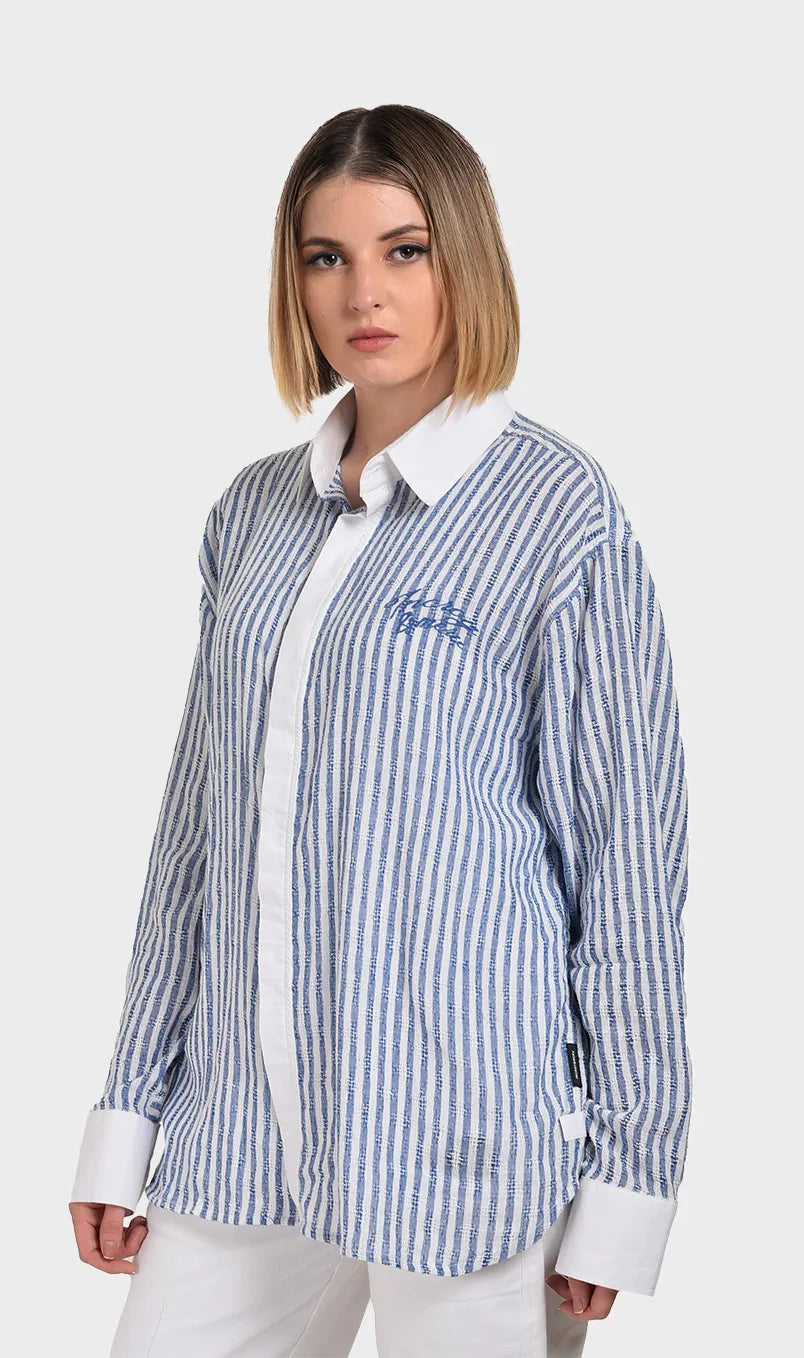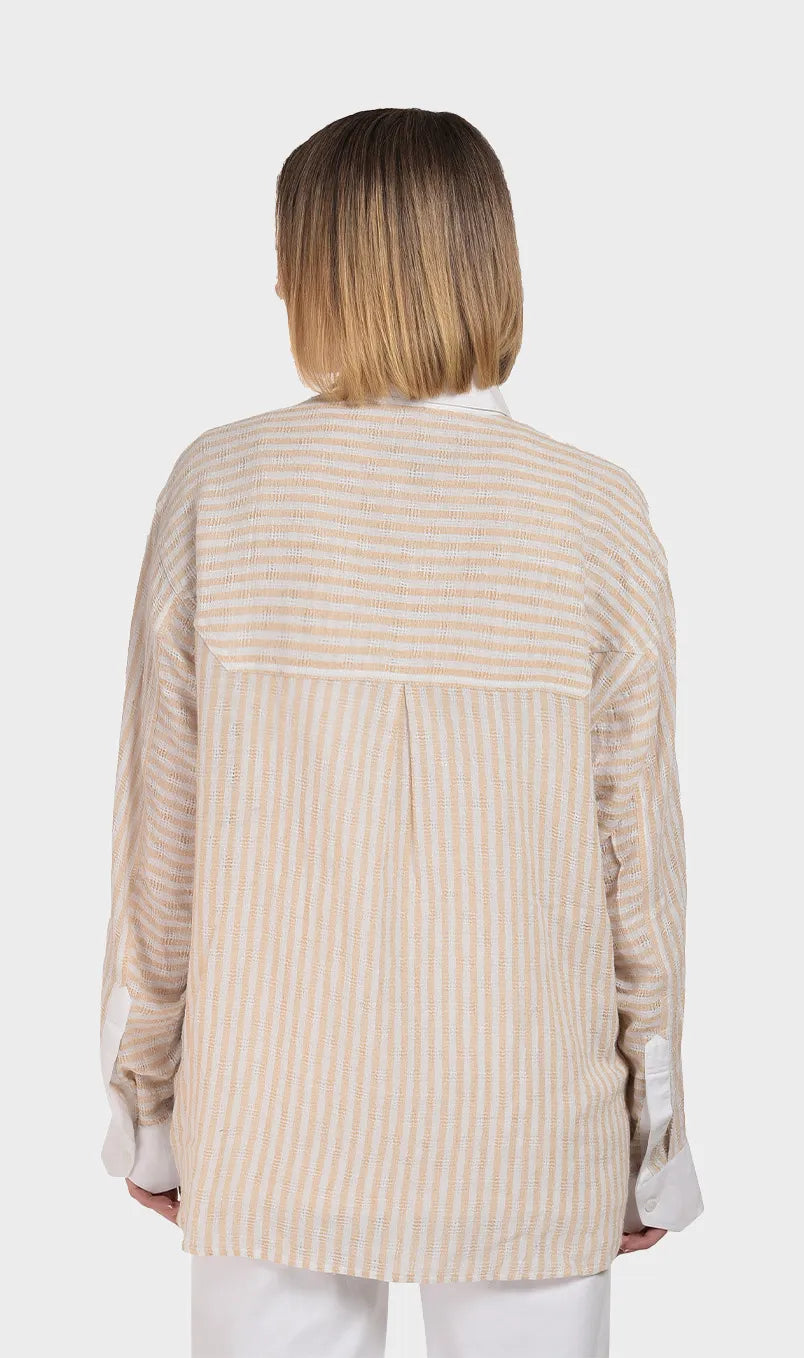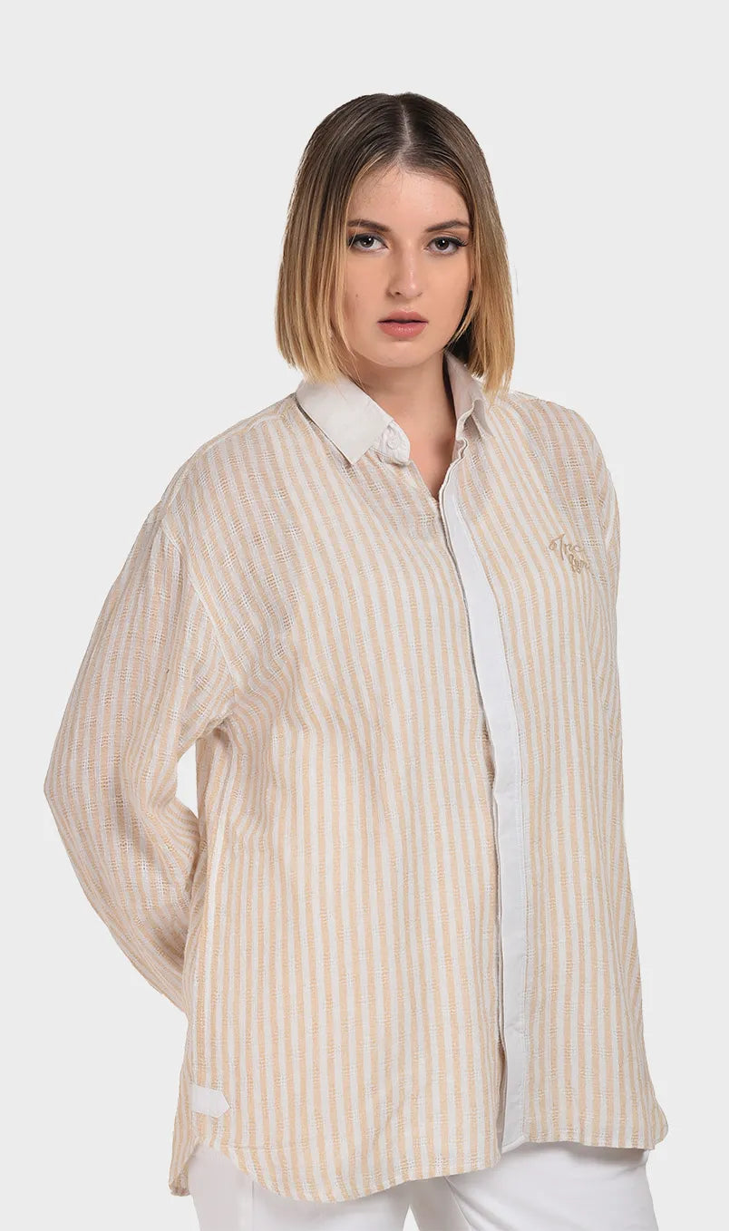 In soft cotton dobby with effortless beige-white and blue-white stripe…