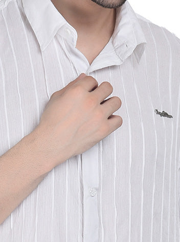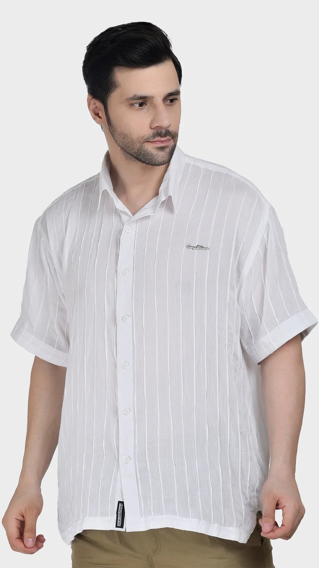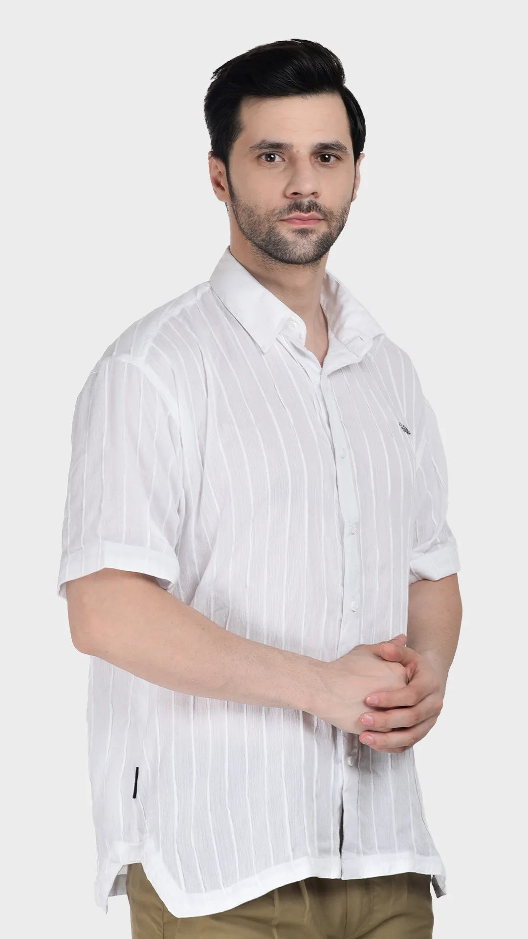 It offers a crisp, timeless white, it’s where precision tailoring meets unbothered ease. The subtle pin tuck detailing adds texture without noise, making it equally at home at a sunlit brunch or an unplanned late-night gathering. Available in half or full sleeves, this unisex piece drapes effortlessly, letting you decide how formal or free the afternoon gets.",