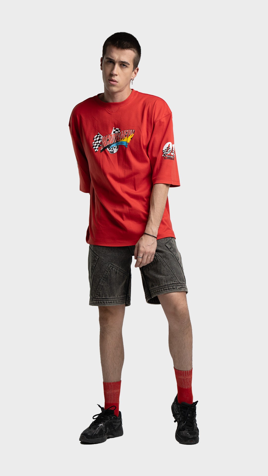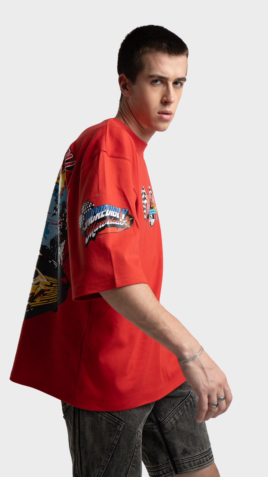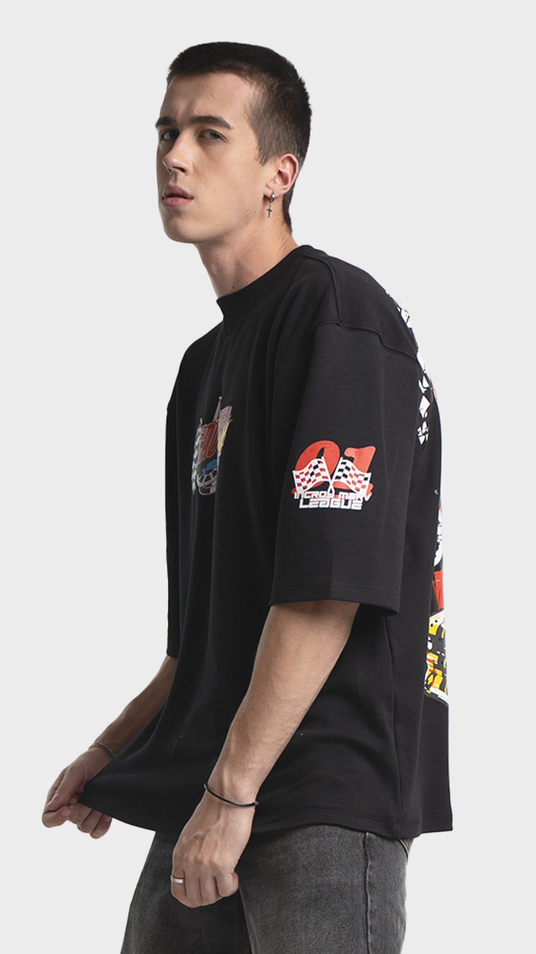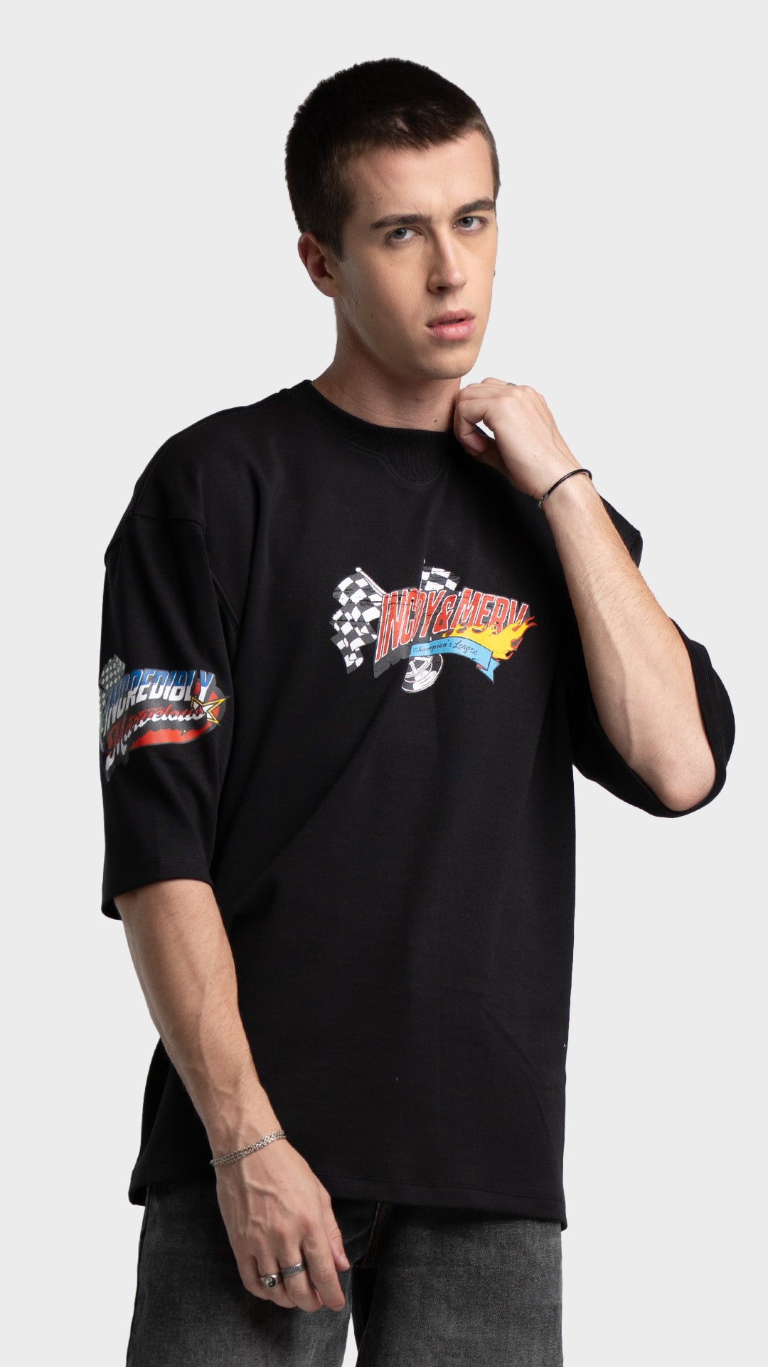 Introducing the Rage Oversized Half‑Sleeve Tee, crafted from premium 240 GSM cotton interlock jersey. This vibrant piece delivers bold energy with a clean luxury streetwear feel. It features striking racing‑inspired screen prints on the front, back, and sleeves, combined with a colorful block print for added visual impact. Designed for comfort, attitude, and a standout silhouette, this tee blends color and character effortlessly.