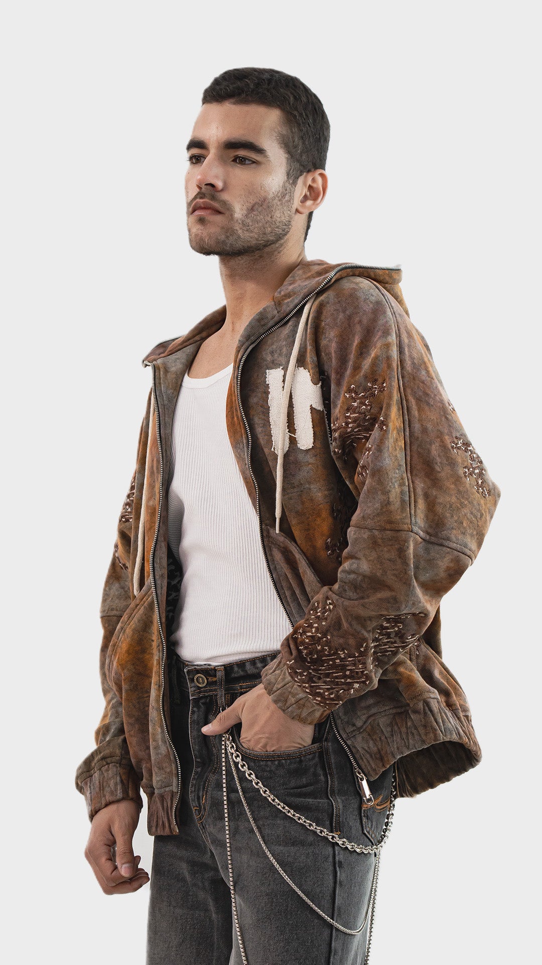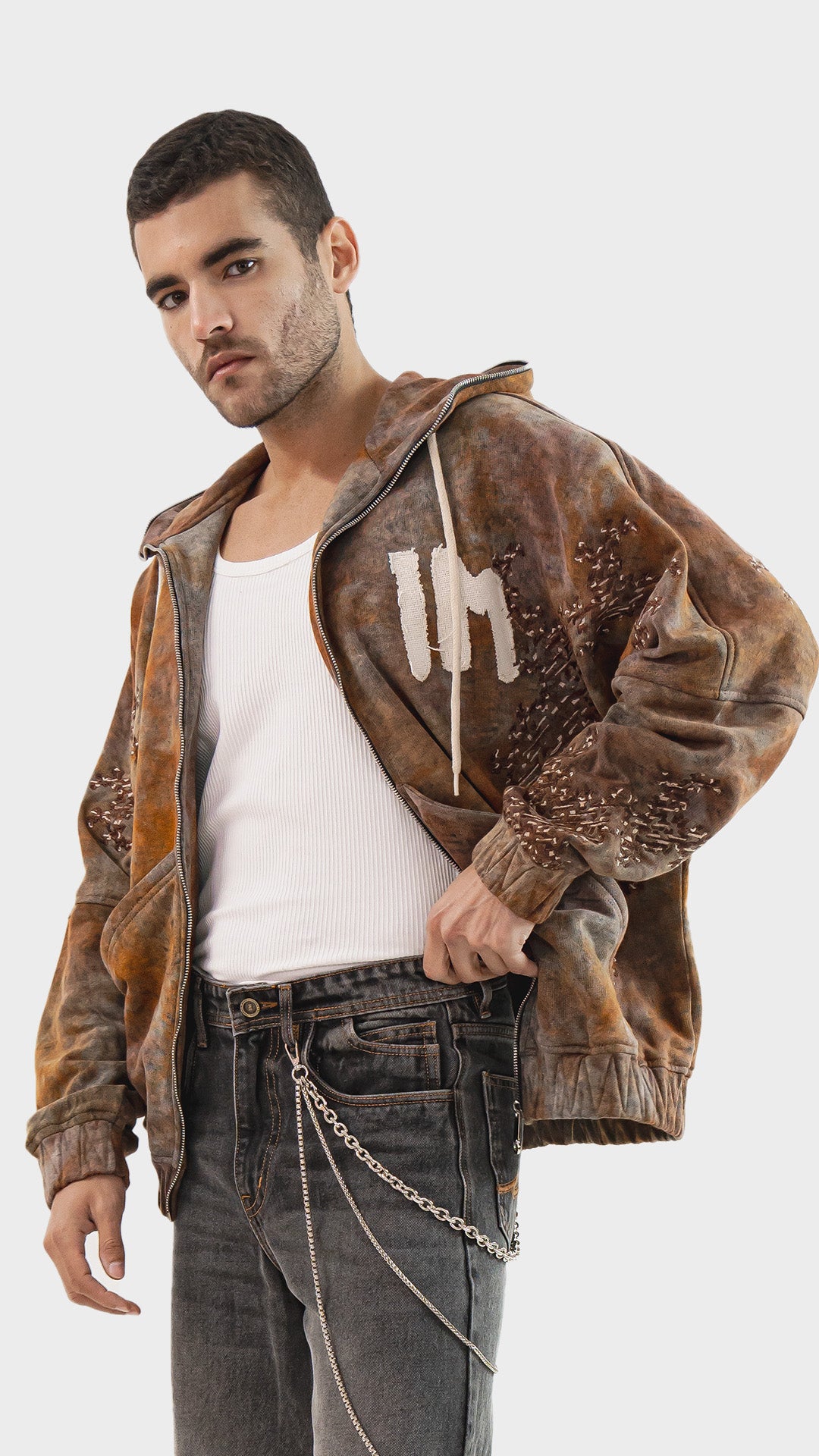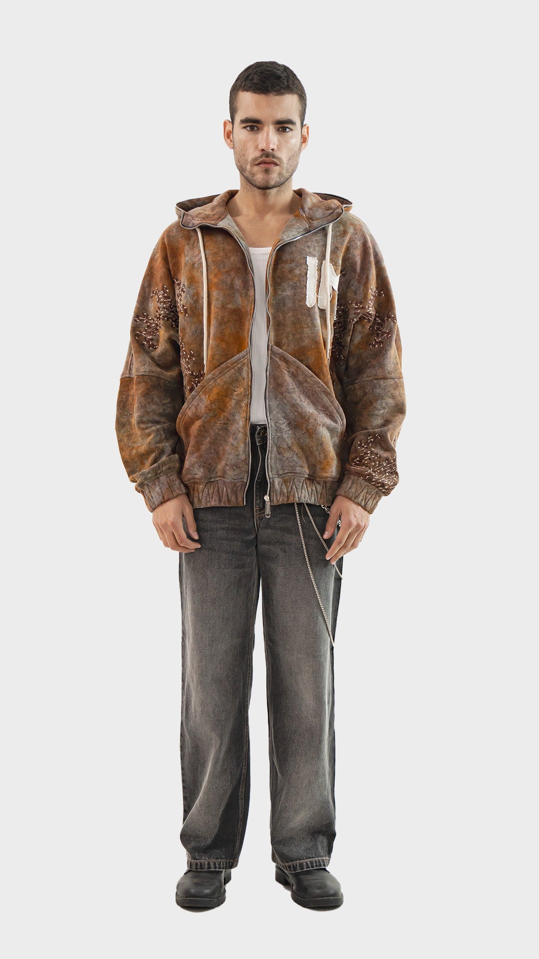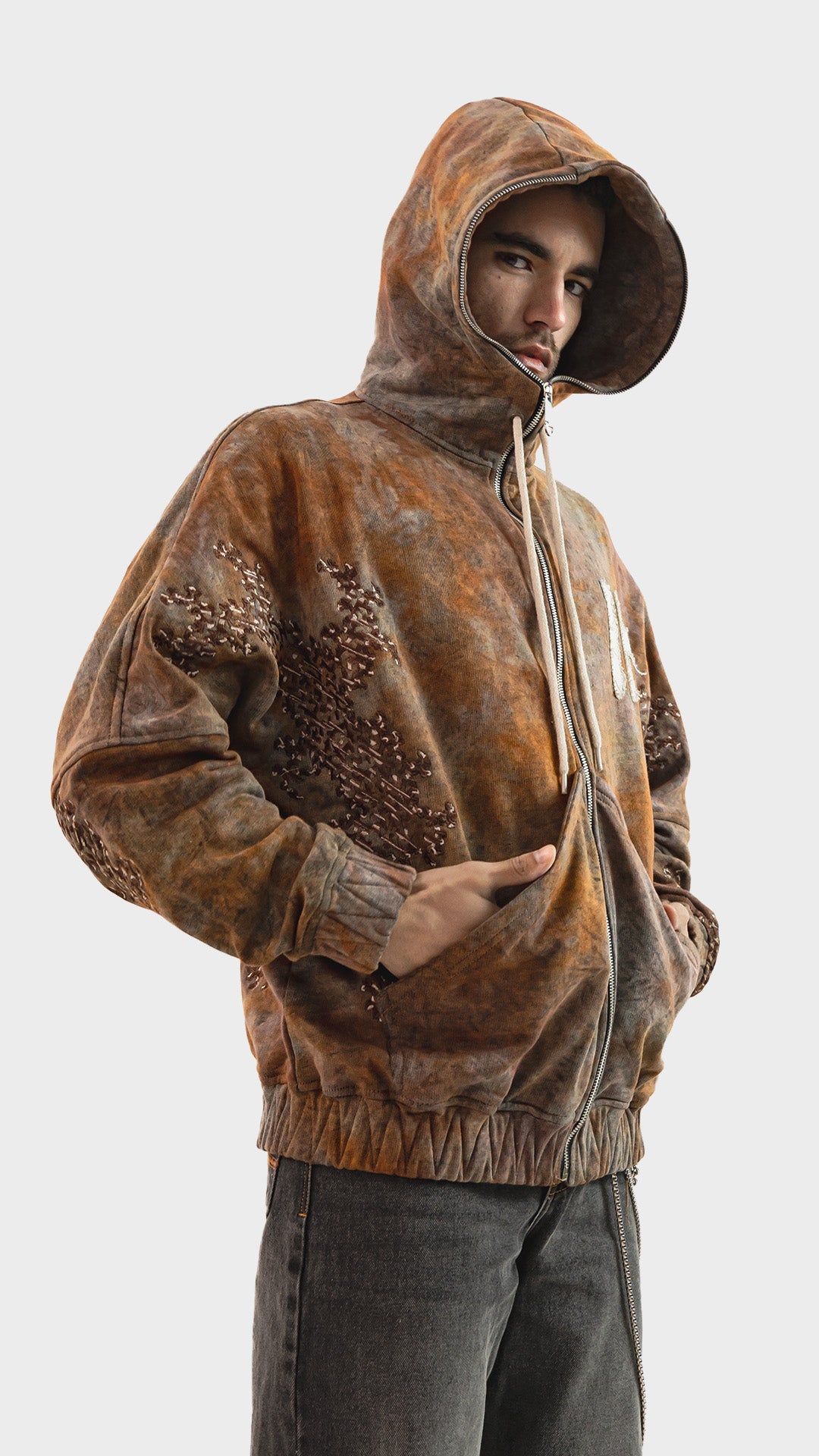 Introducing the Embroidered Zip‑Up Hoodie, crafted from premium cotton fleece and finished with a rustic tie‑dye acid wash for a naturally worn‑in colour tone. Designed with statement branding patches enhanced by satin embroidery, the hoodie balances raw texture with refined detailing. Built in a full zip‑up silhouette, it offers easy layering and everyday versatility. The design is completed with a lined hood, drawstrings, a functional front pocket, and elasticated hem and cuffs for a secure, comfortable fit.